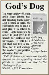 Hope Ryden is a well-known naturalist and author of 23 books. Her behavioral findings have been published in National Geographic, Smithsonian, and Audubon magazine, and her books have been translated into German, Swedish, Finnish, Norwegian, Dutch, Spanish, Italian and Russian. She is the author of God’s Dog: A Celebration of the North American Coyote. Please see the C.A.S.H. catalog to order a copy of God’s Dog.