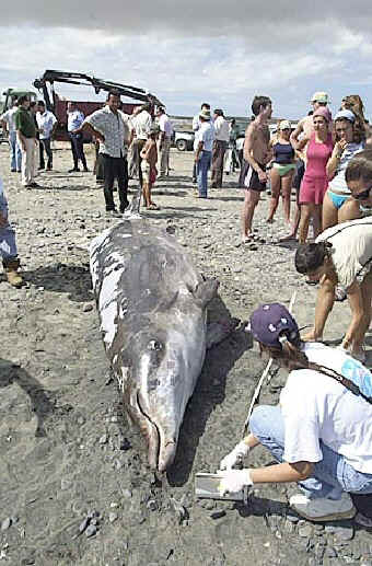 Rescuers examine one of several beaked whales that died during our sonar exercises off the Canary Islands in 2002 as published in the LA Times