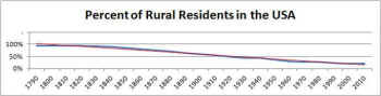 Changing demographic factors in the U.S. are driving the trend of decreasing hunting participation. One of the most important trends is the increasing urbanization of the U.S. Most of the population now lives in non-rural housing, with increasing urbanization expected to continue for some time. According to the U.S. Census Bureau, in 1950, 36% of the U.S. population lived in a rural area. This percentage went down to 30% in 1960, to 25% by 1990, and down to 22% in 2000. This demographic trend is important because hunting participation is positively correlated with living in a rural area (RM 2004a, 2005a, 2006b).