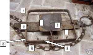 When we know the trapper’s most commonly used techniques for luring and trapping animals we can see that it is very unlikely for an animal to be caught by the face. To understand how a leghold trap catches animals, take a look at figure 1. The main parts are #1 pan; #2 jaws; #3 spring; #4 chain; #5 the “dog”; #6 teeth.