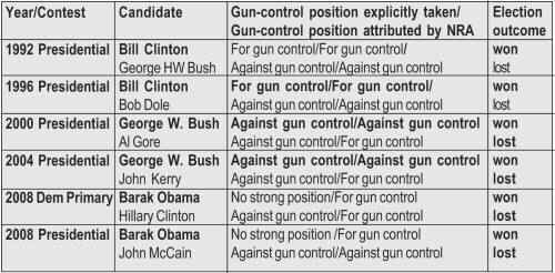 What is apparent from the chart is that taking an explicit position against Gun Control is no assurance of winning – far from it. In the above six contests, all losers took an explicit position against gun control. The lesson for future presidential candidates should be clear: Do not take an anti-gun control position – the NRA can’t deliver its votes to you and never has been able to do so!
