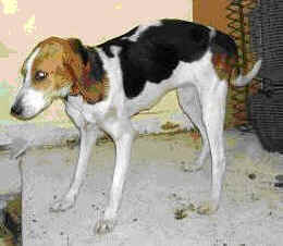 URGENT!!!!! KQ5046- This is a fox-hound mix, a lady in need of a rescue. She is rather thin at 30lbs, but is only about 1 year old. She has beautiful markings and will make a great pet! PAST DUE!! Just one doggie of so many.